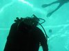 Menin ensinmäisenä veteen, jotta sain videolle muiden avannosta veteen tulemisen. Näkyväisyys oli ihan mahdottoman hyvä. Kuvatessa sukelluskavereiden tuloa, huomasin, että kuplia tuli jostain varusteista ja paljastui, että akkukotelo vuoti oikein kunnolla. Ei muuta kuin isolamppu irti ja jätin sen dekotasanteelle. Kuvasin reunan tuntumasta kun muut lähtivät alaspäin ja seurailin perässä. Alas kun pääsi niin näkyväisyys oli edelleen tolkuttoman hyvä, mutta kun se ison valon akkukotelo sanoi sopimuksen irti, niin eipä sitä saanut minkäänlaista kuvaa!!! Siis nyt tarvii panostaa niihin kameran valoihin!!